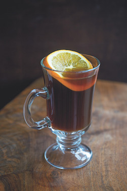 將除了阿夸維特、黑櫻桃利口酒和橙圈的所有原料放入真空低溫袋中,用60攝氏度的溫度烹調60分鐘。濾入帶蓋的瓶子,密封并將置于水浴中,直至達到上桌效果。配上橙圈裝飾,趁熱享用。