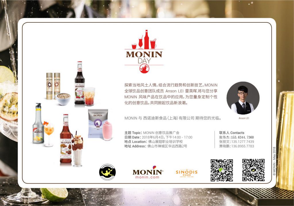 事隔大半年,2018年的6月4日展翅學校再一次攜手MONIN全球飲品創意團隊成員Anson Lei 雷英暉為學員們再次帶來一場MONIN品牌創意飲品推廣會 探索當地風土人情,結合流行趨勢和創新技藝,Anson Lei 雷英暉將會與您分享MONIN風味產品在飲品中的應用,為您量身定制個性化的創意飲品,共同掀起飲品新浪潮。