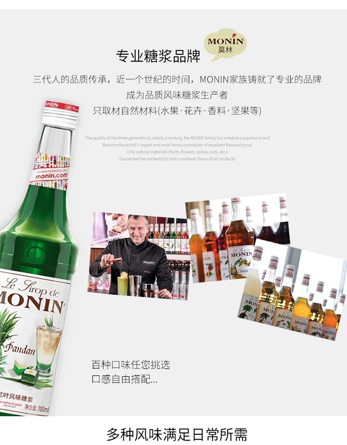 1912 年,Georges MONIN在法國創(chuàng)立了以家族名字命名的品牌與第一家工廠,專注生產(chǎn)優(yōu)質(zhì)利口酒與糖漿。因他對待品質(zhì)的熱誠與執(zhí)著讓產(chǎn)品脫穎而出,讓MONIN成為優(yōu)質(zhì)產(chǎn)品的代名詞,現(xiàn)已是世界上著名的風味糖漿生產(chǎn)者。近年來,MONIN堅持不斷創(chuàng)新,嚴打新風味與應用方式,致力于傳遞完美餐飲體驗,引領(lǐng)飲品多元化發(fā)展,為餐飲企業(yè)提供完美解決方案!